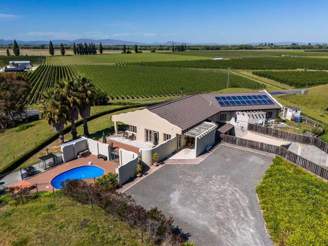 Impressive is the first word that comes to mind as you approach 15C Omarunui Road. This architecturally designed home, infused with Mediterranean flair, sits proudly on an elevated site capturing expansive views across the vineyards toward Te Mata Peak. Built with both functionality and flow in mind, the home offers four bedrooms and two bathrooms, including a generous master suite with a walk-in wardrobe. Two additional large bedrooms and a versatile guest room provide flexible accommodation, while the stylish family bathroom features a thoughtfully designed wet-area shower for easy access. At the heart of the home lies an expansive kitchen and dining area, ideal for both entertaining and everyday living. Two living spaces provide options for relaxation, and a dedicated office/media/security room adds further versatility for modern lifestyles. Practicality meets luxury with abundant storage throughout and a large garage and workshop beneath the 333m2 (approx.) home. Outdoors, the pool and entertainment area offer the perfect setting for hosting guests or enjoying quiet family time – there’s room for every occasion. Set on approximately 1.2 hectares of gently rolling, usable land, the property enjoys all-day sun and sweeping eastern views. It’s perfectly suited for lifestyle pets, with ample water supplied from a local bore. Built to an exceptional standard and positioned just five minutes from Taradale and 15 minutes from Hastings, this is a home that truly delivers on quality, comfort, and lifestyle. Viewings are by appointment – don’t delay; call today to arrange a private viewing.